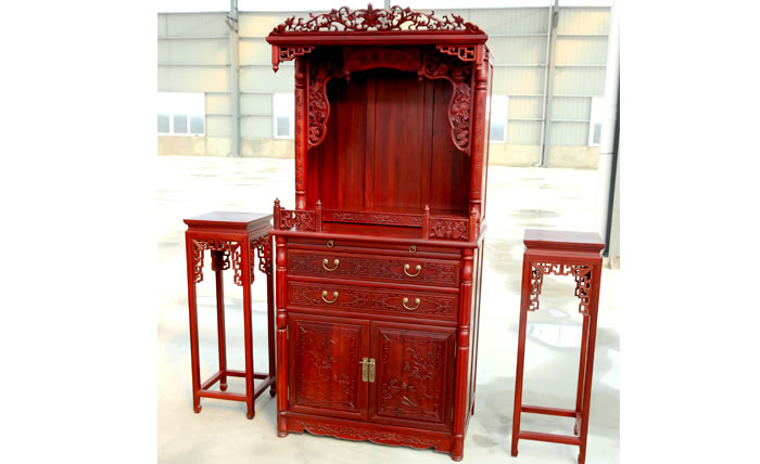 江蘇中尊木業(yè)有限公司臥室系列產品:佛光普照大佛龕,臥房四件套富貴大床、富貴大床床邊柜、四門衣柜等。