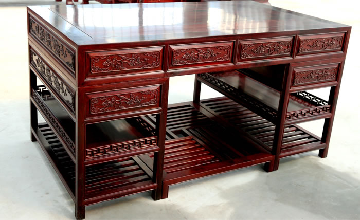 江蘇中尊木業(yè)有限公司書房系列產品:書房五件套草龍書柜、草龍大班枱、卷書寶座椅,洋花寫字枱等。